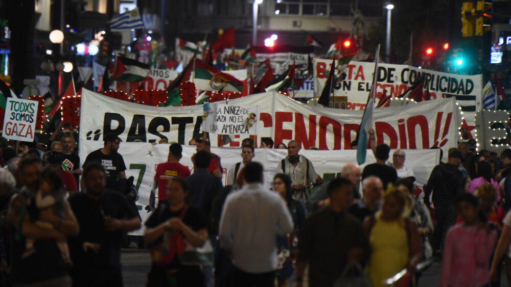 Durante la marcha se escucharon consignas no solamente en solidaridad con Palestina y de repudio al genocidio que lleva adelante el Estado sionista, sino también de crítica al gobierno frenteamplista de Yamandú Orsi. Un grupo de personas cantaba, por ejemplo: “Orsi, tibio, decí que es genocidio”.